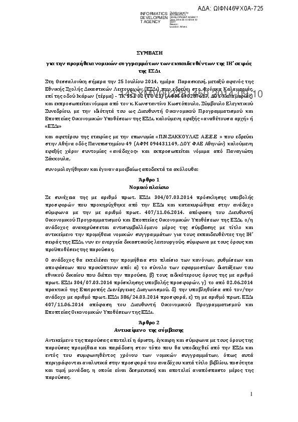 3. Σύμβαση προμήθειας ΄νομικών συγγραμμάτων για τους εκπαιδευομένους της ΙΘ΄σειράς της ΕΣΔι