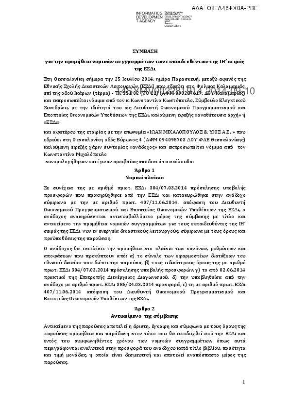 8. Σύμβαση προμήθειας νομικών συγγραμμάτων για τους εκπαιδευθέντες της ΙΗ΄σειράς της ΕΣΔι