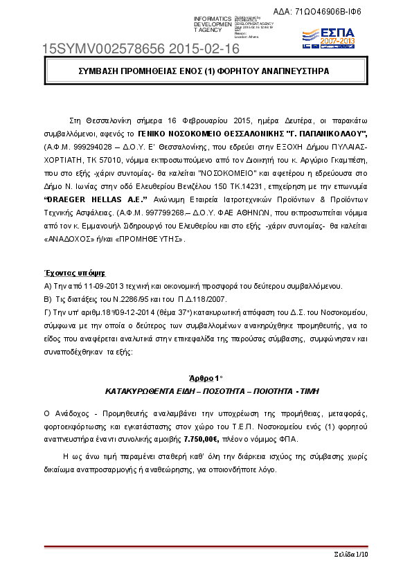 7. ΣΥΜΒΑΣΗ ΠΡΟΜΗΘΕΙΑΣ ΕΝΟΣ (1) ΦΟΡΗΤΟΥ ΑΝΑΠΝΕΥΣΤΗΡΑ ΜΕ ΕΤΑΙΡΕΙΑ "DRAEGER HELLAS Α.Ε."