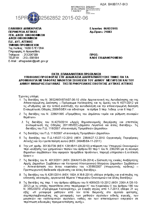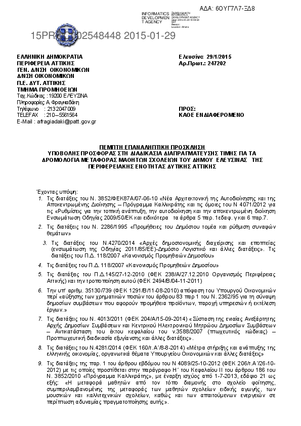 4. ΕΠΑΝΑΛΗΠΤΙΚΗ ΠΡΟΣΚΛΗΣΗ ΥΠΟΒΟΛΗΣ ΠΡΟΣΦΟΡΑΣ ΣΤΗ ΔΙΑΔΙΚΑΣΙΑ ΔΙΑΠΡΑΓΜΑΤΕΥΣΗΣ ΤΙΜΗΣ ΓΙΑ ΤΑ ΔΡΟΜΟΛΟΓΙΑ ΜΕΤΑΦΟΡΑΣ ΜΑΘΗΤΩΝ ΣΧΟΛΕΙΩΝ ΤΟΥ ΔΗΜΟΥ ΕΛΕΥΣΙΝΑΣ ΤΗΣ ΠΕΡΙΦΕΡΕΙΑΚΗΣ ΕΝΟΤΗΤΑΣ ΔΥΤΙΚΗΣ ΑΤΤΙΚΗΣ