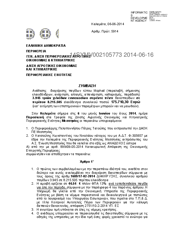 10. Σύμβαση ανάθεσης διαχείρισης παγίδων τύπου Mcphail για το πρόγραμμα Δακοκτονίας 2014 της ΠΕ Μεσσηνί