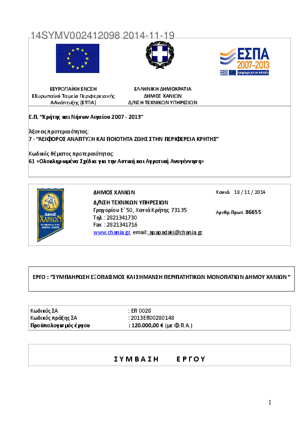 2. ΣΥΜΒΑΣΗ ΓΙΑ ΤΟ ΕΡΓΟ : ‘’ΣΥΜΠΛΗΡΩΣΗ ΕΞΟΠΛΙΣΜΟΣ ΚΑΙ ΣΗΜΑΝΣΗ ΠΕΡΙΠΑΤΗΤΙΚΩΝ ΜΟΝΟΠΑΤΙΩΝ ΔΗΜΟΥ ΧΑΝΙΩΝ‘’