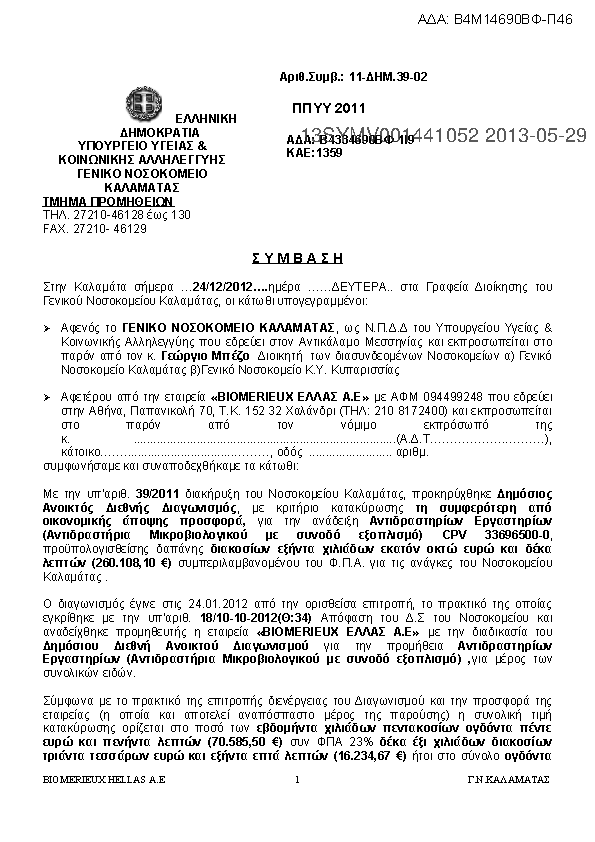1. Αρ. Διακήρυξης: 19/2013 Δημόσιος Διεθνής Ανοικτός Επαναληπτικός Διαγωνισμός για την προμήθεια ΑΝΑΙΣΘΗΣΙΟΛΟΓΙΚΟΥ ΣΥΓΚΡΟΤΗΜΑTΟΣ ΠΛΗΡΕΣ (τεμ. 5)