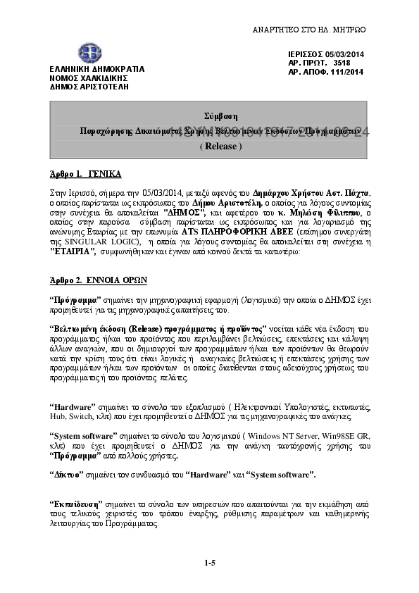 3. Σύμβαση Παραχώρησης Δικαιώματος Χρήσης Βελτιωμένων Εκδόσεων Προγραμμάτων ( Release )