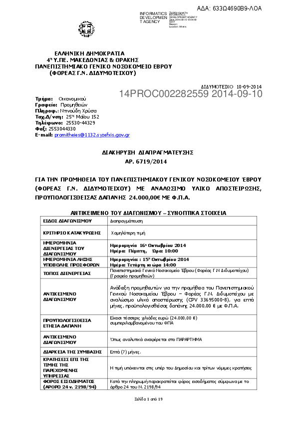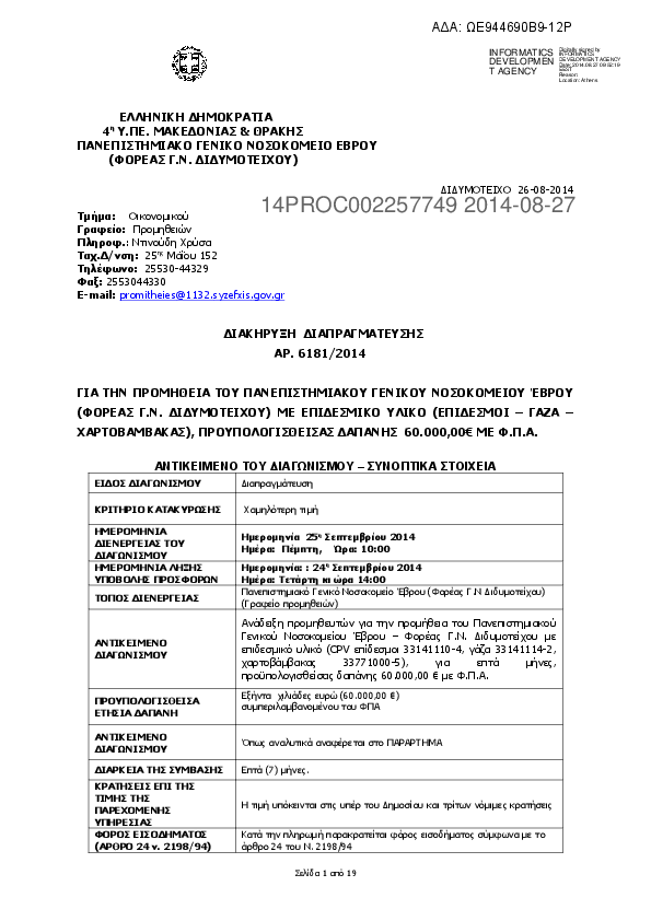 1. ΔΙΑΚΗΡΥΞΗ ΠΡΟΧΕΙΡΟΥ ΔΙΑΓΩΝΙΣΜΟΥ ΤΟΥ Π.Γ.Ν. ΕΒΡΟΥ (Γ.Ν. ΔΙΔ/ΧΟΥ) ΜΕ ΑΝΑΛΩΣΙΜΟ ΥΛΙΚΟ ΑΠΟΣΤΕΙΡΩΣΗΣ