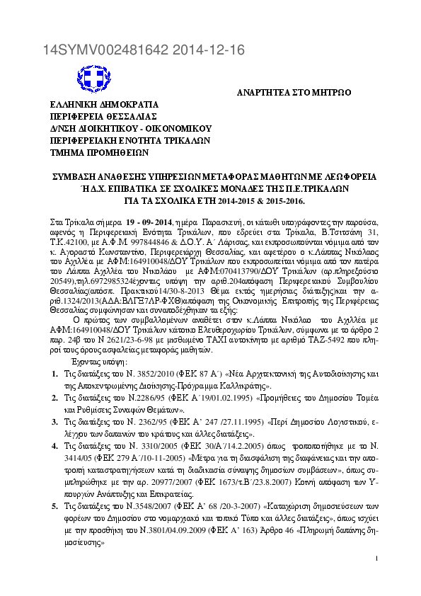 1. ΣΥΜΒΑΣΗ ΑΝΑΘΕΣΗΣ ΥΠΗΡΕΣΙΩΝ ΜΕΤΑΦΟΡΑΣ ΜΑΘΗΤΩΝ ΤΗΣ Π.Ε.ΤΡΙΚΑΛΩΝΓΙΑ ΤΑ ΣΧΟΛΙΚΑ ΕΤΗ 2014-2015 & 2015-201