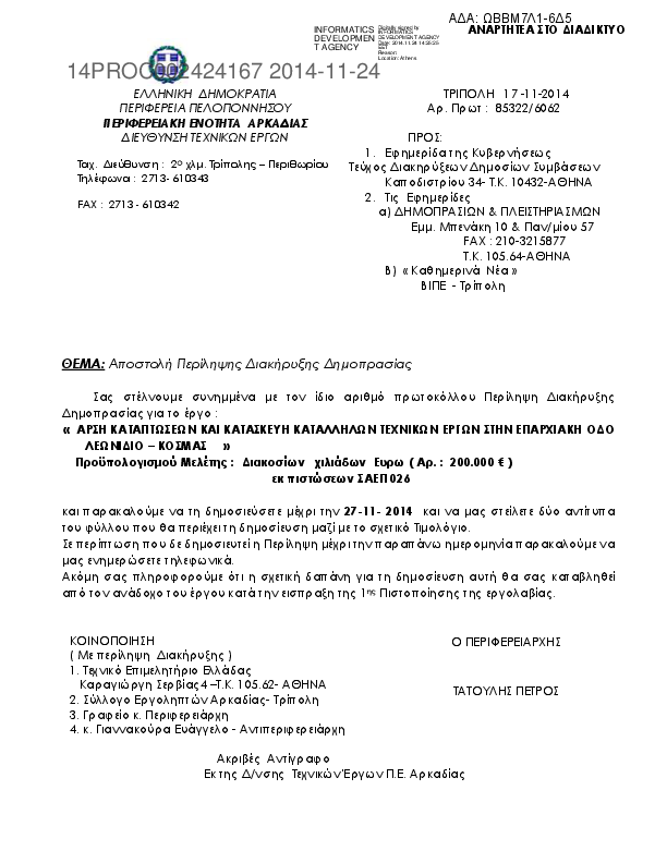 5. Αποστολή Περίληψης Διακήρυξης ΔημοπρασίαςΔημοπρασίας για το έργο : « ΑΡΣΗ ΚΑΤΑΠΤΩΣΕΩΝ ΚΑΙ ΚΑΤΑΣΚΕΥΗ ΚΑΤΑΛΛΗΛΩΝ ΤΕΧΝΙΚΩΝ ΕΡΓΩΝ ΣΤΗΝ ΕΠΑΡΧΙΑΚΗ ΟΔΟ ΛΕΩΝΙΔΙΟ – ΚΟΣΜΑΣ »