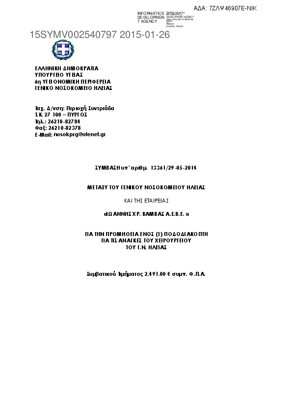 1. ΓΙΑ ΤΗΝ ΠΡΟΜΗΘΕΙΑ ΕΝΟΣ ΠΟΔΟΔΙΑΚΟΠΤΗ ΓΙΑ ΤΙΣ ΑΝΑΓΚΕΣ ΤΟΥ ΧΕΙΡΟΥΡΓΕΙΟΥ ΤΟΥ Γ.Ν. ΗΛΕΙΑΣ