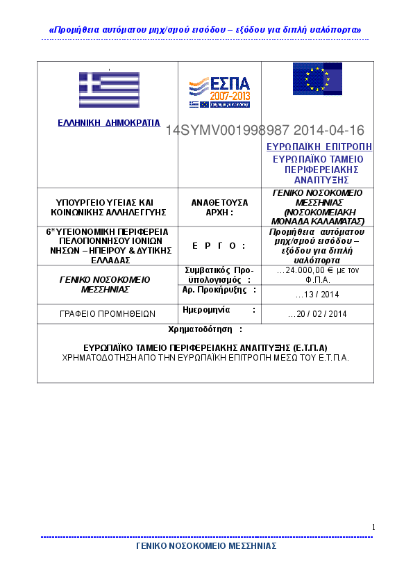4. Αρ.Διακήρυξης: 15/2013 Το Γ.Ν. Μεσσηνίας διενεργεί Δημόσιο Ανοικτό Επαναληπτικό Διαγωνισμό για την προμήθεια Οφθαλμολογικού εξοπλισμού (Αναλώσιμα υλικά φακοθρυψίας με συνοδό εξοπλισμό ) (CPV 33122000-1) για τις ανάγκες της Νοσοκομειακής ...