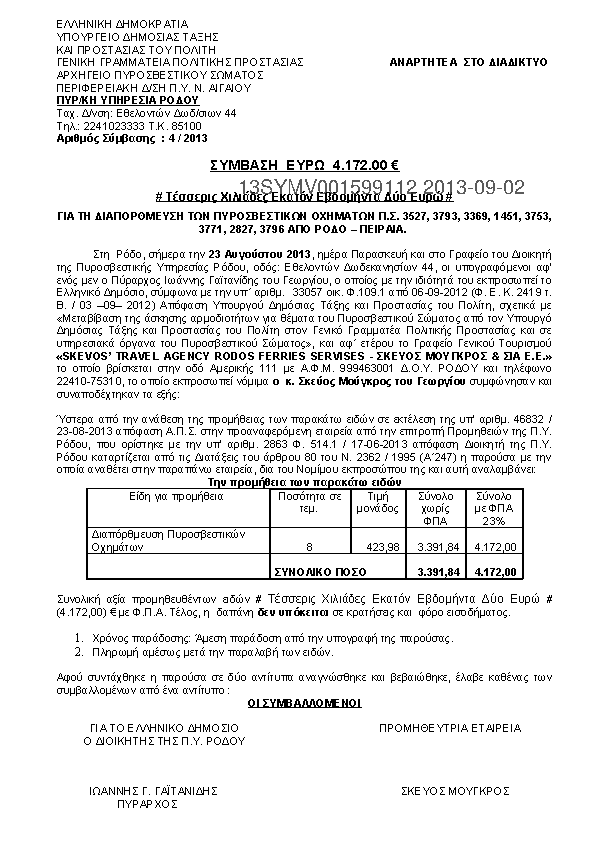 9. ΣΥΜΒΑΣΗ 4.172,00 ΕΥΡΩ ΓΙΑ ΤΗ ΔΙΑΠΟΡΘΜΕΥΣΗ ΟΧΤΩ ΠΥΡ/ΚΩΝ ΟΧΗΜΑΤΩΜ ΑΠΟ ΡΟΔΟ ΓΙΑ ΠΕΙΡΑΙΑ