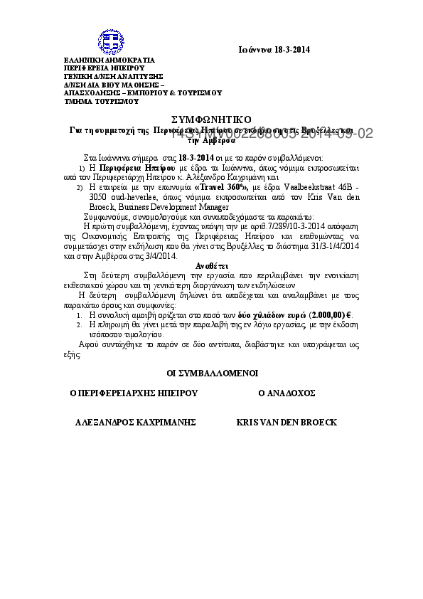 1. Συμφωνητικό για τη συμμετοχή της Περιφέρειας Ηπείρου σε εκδήλωση στις Βρυξέλλες και την Αμβέρσα