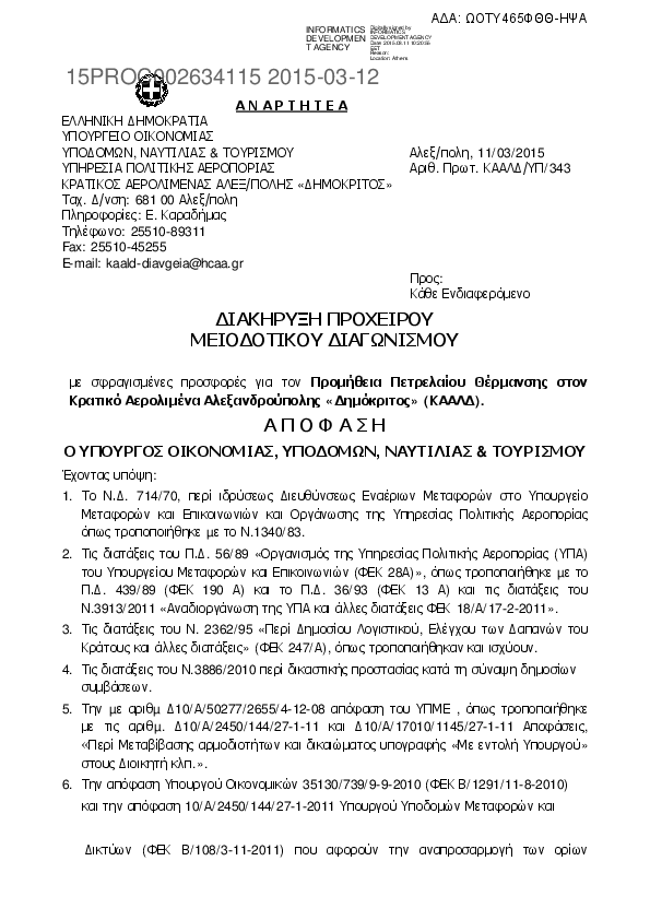 10. ΔΙΑΚΗΡΥΞΗ ΠΡΟΧΕΙΡΟΥ ΜΕΙΟΔΟΤΙΚΟΥ ΔΙΑΓΩΝΙΣΜΟΥµε σφραγισμένες προσφορές για τον Προμήθεια Πετρελαίου Θέρμανσης στον Κρατικό Αερολιμένα Αλεξανδρούπολης «Δημόκριτος» (ΚΑΑΛΔ).