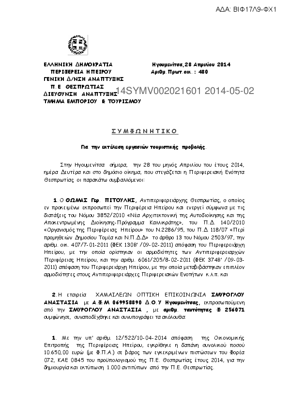 7. Συμφωνητικό για την εκτέλεση εργασιών τουριστικής προβολής - ΠΕ Θεσπρωτίας