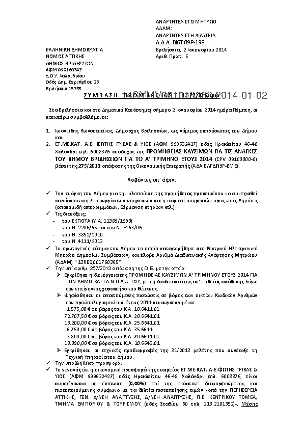 2. ΣΥΜΒΑΣΗ ΠΡΟΜΗΘΕΙΑΣ ΚΑΥΣΙΜΩΝ ΓΙΑ ΤΙΣ ΑΝΑΓΚΕΣ ΤΟΥ ΔΗΜΟΥ ΒΡΙΛΗΣΣΙΩΝ ΓΙΑ ΤΟ Α’ ΤΡΙΜΗΝΟ ΕΤΟΥΣ 2014