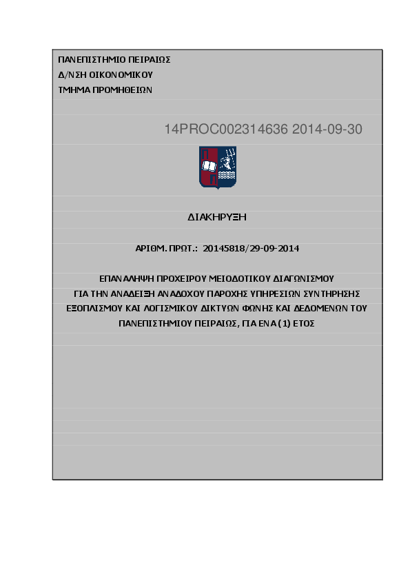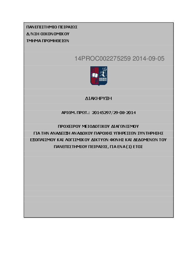 1. Δημόσιος Ανοικτός Διαγωνισμός με σφραγισμένες προσφορές και κριτήριο κατακύρωσης τη χαμηλότερη τιμή για την ανάδειξη αναδόχου, για την προμήθεια εξοπλισμού και λογισμικού πληροφορικής και επικοινωνιών του Πανεπιστημίου Πειραιώς.