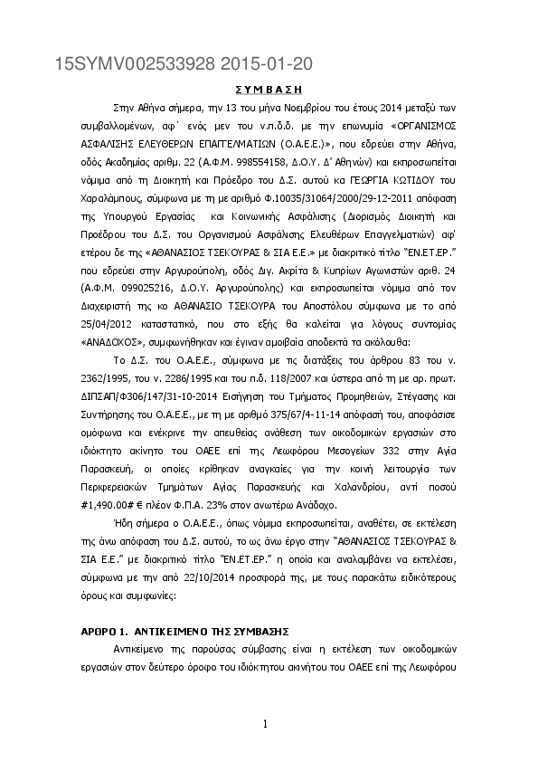 1. Σύμβαση εκτέλεσης οικοδομικών εργασιών στο ιδιόκτητο ακίνητο του ΟΑΕΕ επί της Λ. Μεσογείων 332