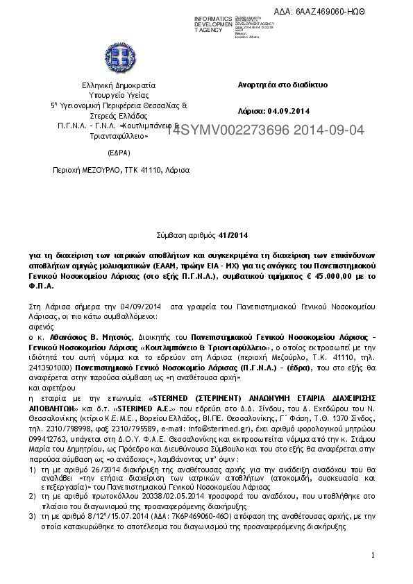 10. ΣΥΜΒΑΣΗ ΜΕ "STERIMED AE" ΓΙΑ ΤΗ ΔΙΑΧΕΙΡΙΣΗ ΑΠΟΒΛΗΤΩΝ ΕΑΑΜ (πρώην ΕΙΑ-ΜΧ) ΓΙΑ ΤΙΣ ΑΝΑΓΚΕΣ ΤΟΥ ΠΓΝΛΑΡΙ