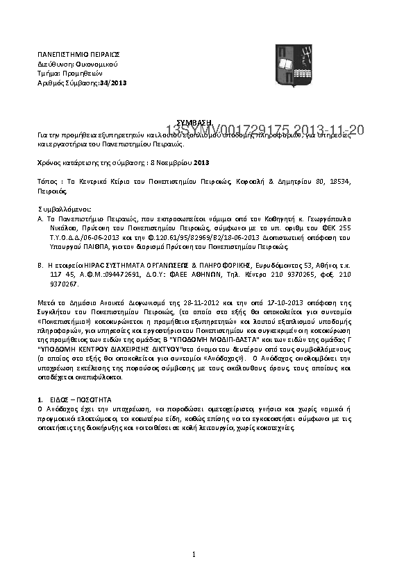4. ΣΥΜΒΑΣΗ ΓΙΑ ΤΗΝ ΠΡΟΜΗΘΕΙΑ ΚΑΙ ΤΟΠΟΘΕΤΗΣΗ ΧΩΡΙΣΜΑΤΟΣ ΣΤΟΝ Α ΟΡΟΦΟ ΤΟΥ ΚΕΝΤΡΙΚΟΥ ΚΤΙΡΙΟΥ ΤΟΥ ΠΑΝ.ΠΕΙΡΑ