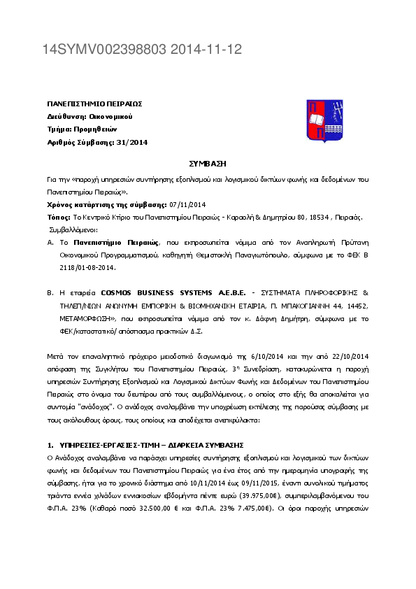 1. Παροχή υπηρεσιών συντήρησης εξοπλισμού και λογισμικού δικτύων φωνής και δεδομένων του Πανεπιστημίου