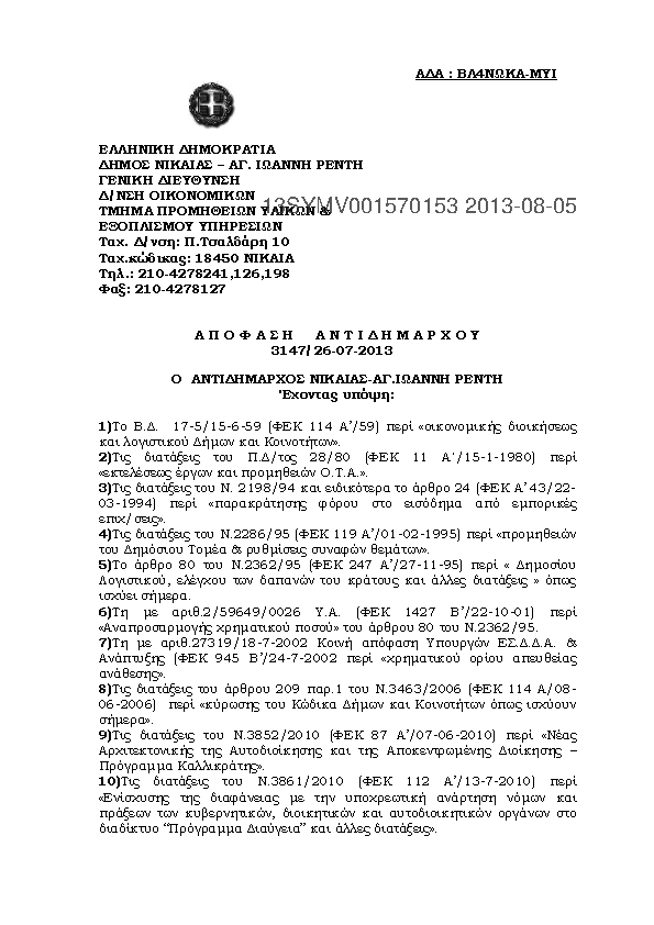 1. ΑΠΟΦΑΣΗ ΔΗΜΑΡΧΟΥ ΣΧΕΤΙΚΑ ΜΕ ΤΗΝ ΑΝΑΝΕΩΣΗ ΤΗΣ ΣΥΝΔΡΟΜΗΣ ΤΟΥ ΔΗΜΟΥ ΝΙΚΑΙΑΣ