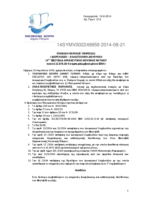 4. Σύμβαση παροχής υπηρεσίας "ΔΙΟΡΓΑΝΩΣΗ–ΚΑΛΛΙΤΕΧΝΙΚΗ ΔΙΕΥΘΥΝΣΗ 14ου ΦΕΣΤΙΒΑΛ ΘΡΗΣΚΕΥΤΙΚΗΣ ΜΟΥΣΙΚΗΣ"