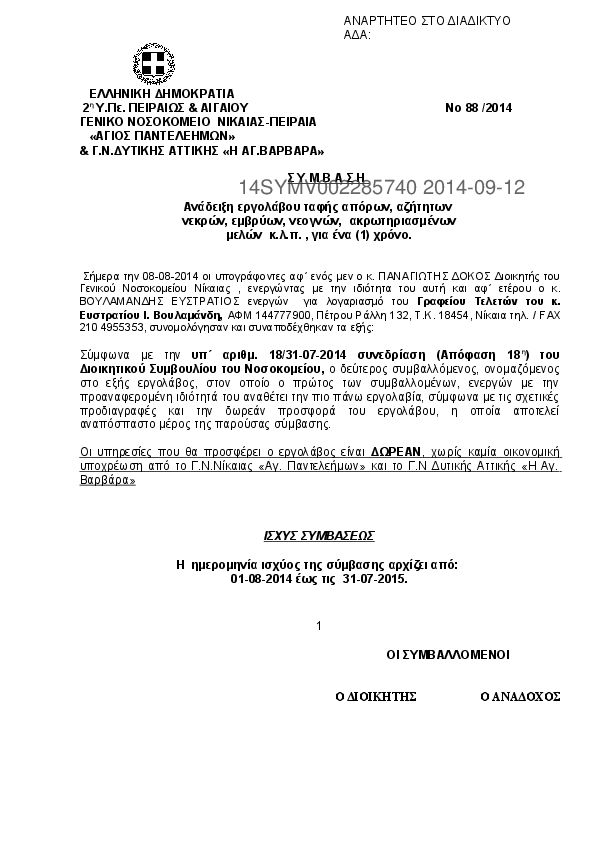 7. ΣΥΜΒΑΣΗ ΝΟ 88/2014 ΓΙΑ ΑΝΑΔΕΙΞΗ ΕΡΓΟΛΑΒΟΥ ΤΑΦΗΣ ΑΠΟΡΩΝ, ΑΖΗΤΗΤΩΝ ΝΕΚΡΩΝ, ΕΜΒΡΥΩΝ, ΝΕΟΓΝΩΝ, ΑΚΡΩΤΗΡΙΑ