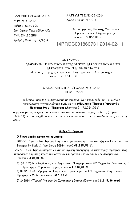 1. ΑΝΑΛΥΤΙΚΗ ΔΙΑΚΗΡΥΞΗ ΓΙΑ ΤΙΣ ΕΡΓΑΣΙΕΣ "Παροχής Υπηρεσιών Προγραμματων Πληροφορικής "Αρ. Μελέτης: 14