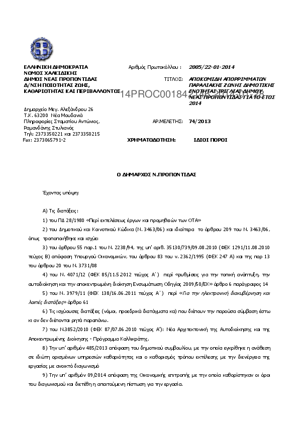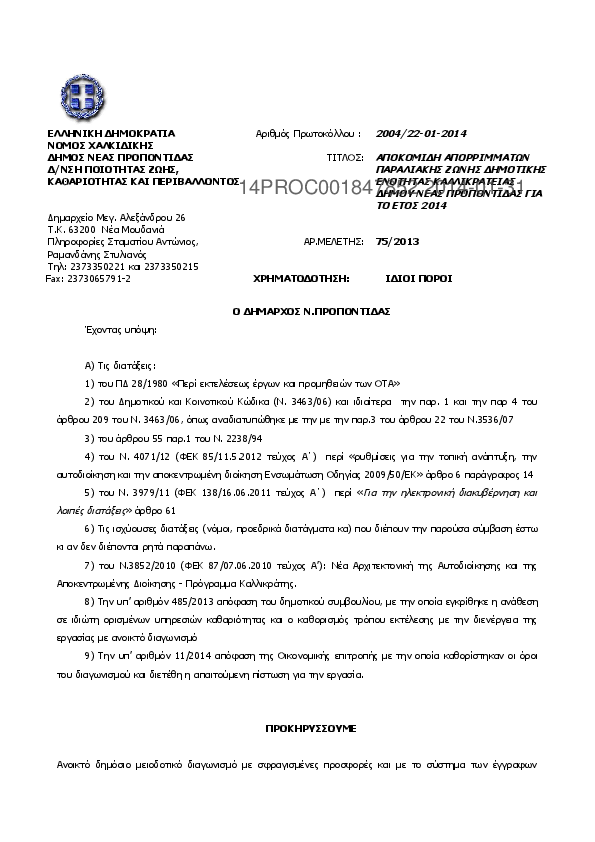 1. ΠΕΡΙΛΗΨΗ ΔΙΑΚΗΡΥΞΗΣ ΠΡΟΧΕΙΡΟΥ ΔΙΑΓΩΝΙΣΜΟΥ ΠΑΡΟΧΗΣ ΥΠΗΡΕΣΙΩΝ ΓΙΑ ΤΗΝ ΑΠΟΚΟΜΙΔΗ ΑΠΟΡΡΙΜΜΑΤΩΝ ΠΑΡΑΛΙΑΚΗΣ ΖΩΝΗΣ ΔΗΜΟΤΙΚΗΣ ΕΝΟΤΗΤΑΣ ΤΡΙΓΛΙΑΣ ΔΗΜΟΥ ΝΕΑΣ ΠΡΟΠΟΝΤΙΔΑΣ ΓΙΑ ΤΟ ΕΤΟΣ 2014