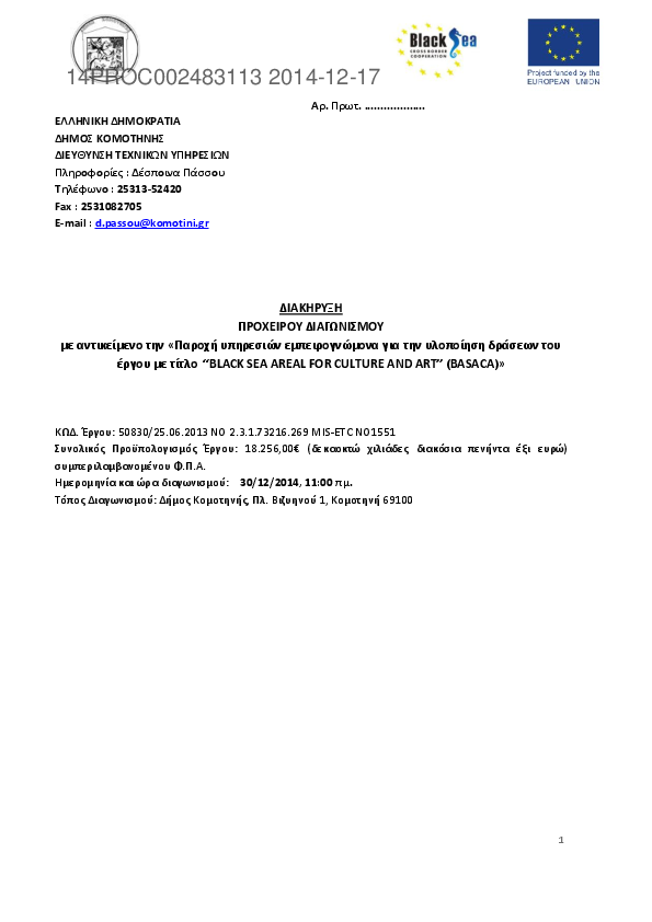 6. Παροχή υπηρεσιών εμπειρογνώμονα για την υλοποίηση δράσεων του έργου με τίτλο “BLACK SEA AREAL FOR CULTURE AND ART” (BASACA)