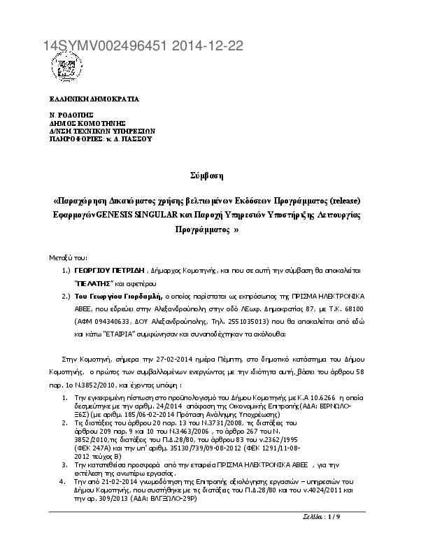 7. Παροχή Δικαιώματος χρήσης Βελτιωμένων Εκδόσεων Προγράμματος (RELEASE) Εφαρμογών GENESIS SINGULAR και