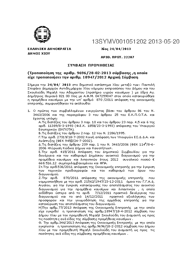 3. Τροποποίηση σύμβασης από προμήθεια καυσίμων και λιπαντικών έτους 2012