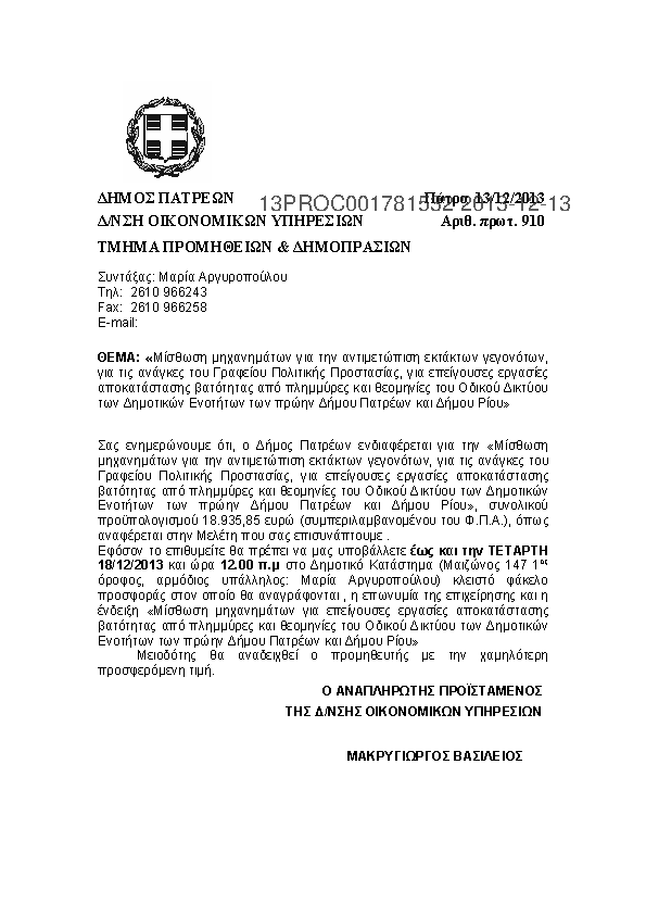 8. ΜΙΣΘΩΣΗ ΜΗΧΑΝΗΜΑΤΩΝ ΓΙΑ ΠΟΛΙΤΙΚΗ ΠΡΟΣΤΑΣΙΑ ΠΡΩΗΝ Δ. ΡΙΟΥ ΚΑΙ ΠΑΤΡΑΣ