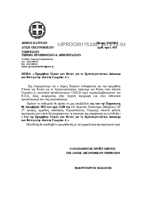 10. ΠΡΟΜΗΘΕΙΑ ΥΛΙΚΩΝ & ΦΥΤΩΝ ΓΙΑ ΤΟ ΧΡΙΣΤΟΥΓΕΝΝΙΑΤΙΚΟ ΔΙΑΚΟΣΜΟ & ΦΑΤΝΗ ΣΤΗΝ ΠΛΑΤΕΙΑ ΓΕΩΡΓΙΟΥ Α΄.