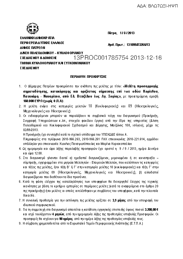 6. ΠΕΡΙΛΗΨΗ ΔΙΑΚΥΡΗΞΗΣ ΓΙΑ ΤΗΝ ΚΥΚΛΟΦΟΡΙΑΚΗ ΜΕΛΕΤΗ ΠΡΟΣΑΡΜΟΓΗΣ ΣΗΜΑΤΟΔΟΤΗΣΗΣ, ΚΑΤΑΚΟΡΥΦΗΣ ΚΑΙ ΟΡΙΖΟΝΤΙΑΣ ΣΗΜΑΝΣΗΣ ΕΠΙ ΤΩΝ ΟΔΩΝ ΚΟΡΙΝΘΟΥ, ΚΑΝΑΚΑΡΗ