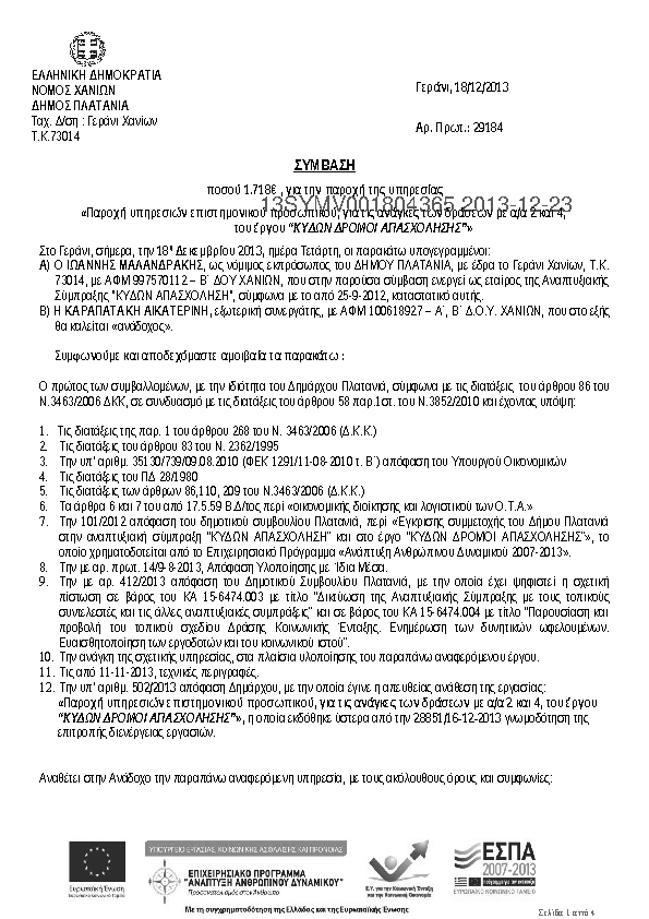 1. Συμφωνητικό έργου «Αντικατάσταση τμημάτων αγωγών άρδευσης ΔΕ Κολυμβαρίου»
