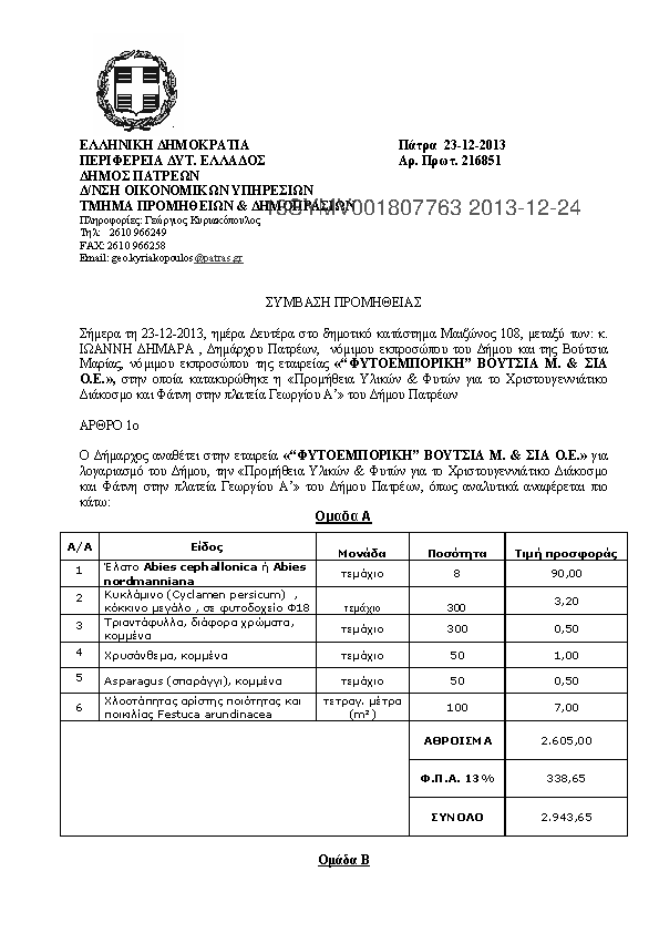 7. ΠΡΟΜΗΘΕΙΑ ΥΛΙΚΩΝ ΚΑΙ ΦΥΤΩΝ ΓΙΑ ΤΟ ΧΡΙΣΤΟΥΓΕΝΝΙΑΤΙΚΟ ΔΙΑΚΟΣΜΟ ΚΑΙ ΦΑΤΝΗ ΣΤΗΝ ΠΛΑΤΕΙΑ ΓΕΩΡΓΙΟΥ Α.