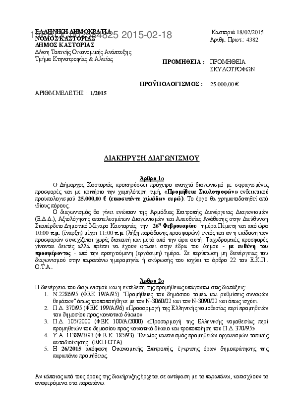 3. Περίληψης διακήρυξης για την προμήθεια σκυλοτροφών