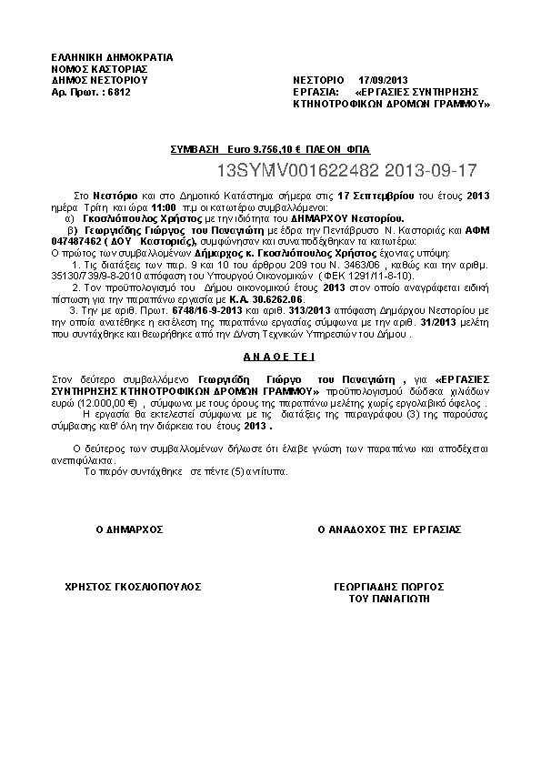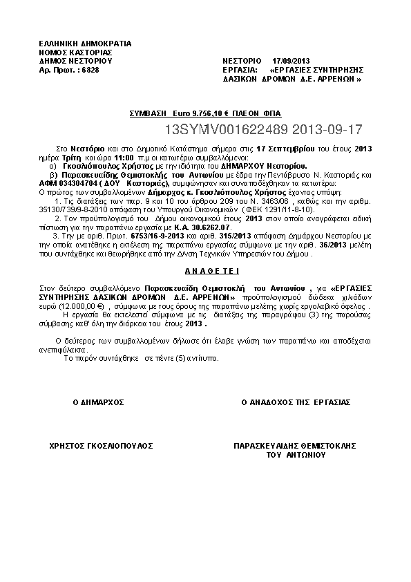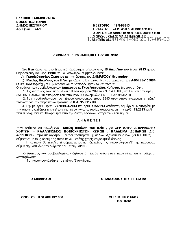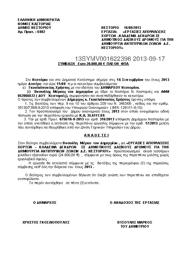 7. ΣΥΜΒΑΣΗ ΑΝΑΘΕΣΗΣ :"ΕΡΓΑΣΙΕΣ ΑΠΟΨΙΛΩΣΗΣ ΧΟΡΤΩΝ ΚΑΛ/ΣΜΟΣ ΚΟΙΝ/ΣΤΩΝ ΧΩΡΩΝ ΚΛΑΔΕΜΑ ΔΕΝΔΡΩΝ Δ.Ε ΑΡΡΕΝΩΝ