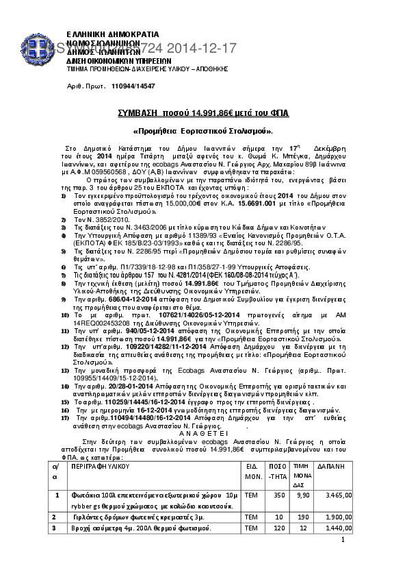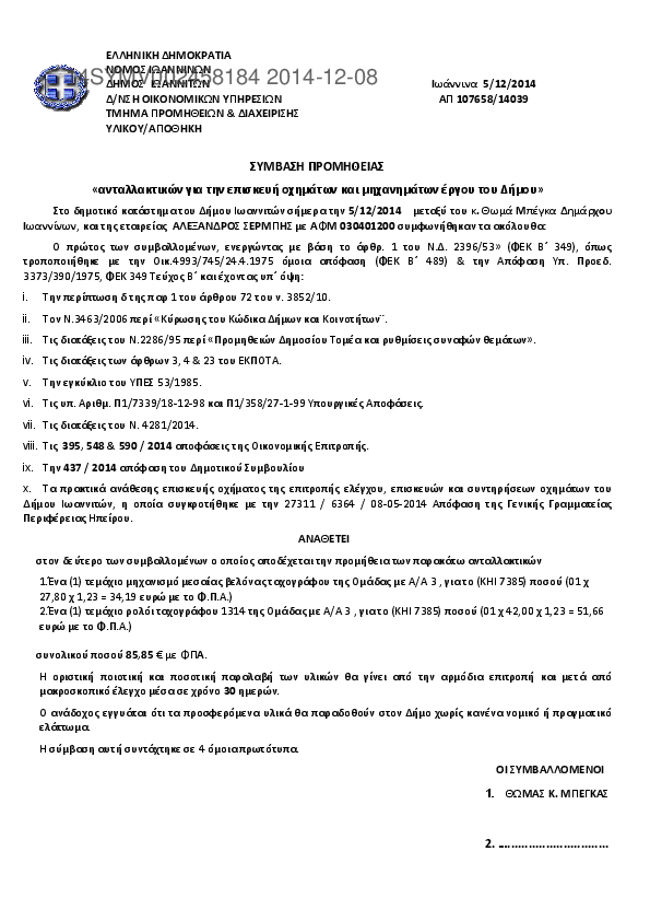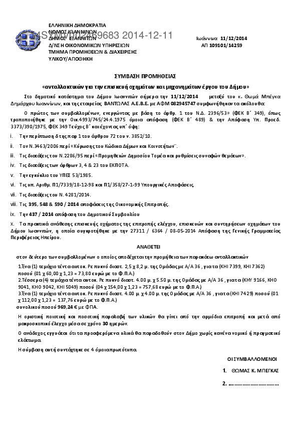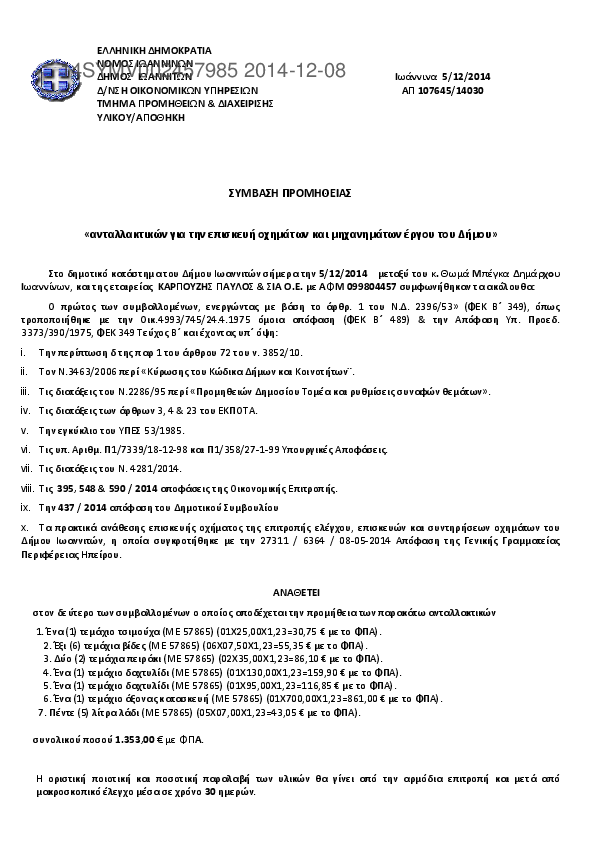 1. ΣΥΜΒΑΣΗ ΠΡΟΜΗΘΕΙΑΣ «ανταλλακτικών για την επισκευή οχημάτων και μηχανημάτων έργου του Δήμου»