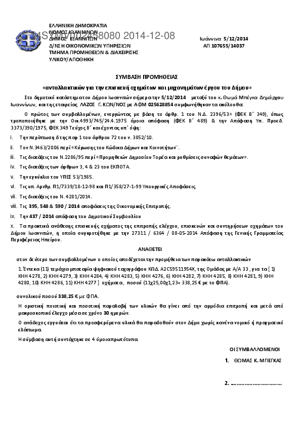 4. ΣΥΜΒΑΣΗ ΠΡΟΜΗΘΕΙΑΣ «ανταλλακτικών για την επισκευή οχημάτων και μηχανημάτων έργου του Δήμου»