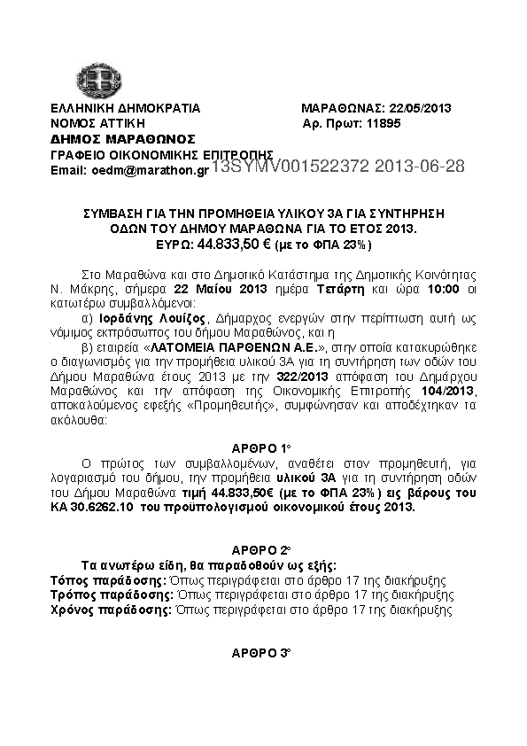 7. ΣΥΜΒΑΣΗ ΓΙΑ ΤΗΝ ΠΡΟΜΗΘΕΙΑ ΥΛΙΚΟΥ 3Α ΓΙΑ ΣΥΝΤΗΡΗΣΗ ΟΔΩΝ ΤΟΥ ΔΗΜΟΥ ΜΑΡΑΘΩΝΑ ΓΙΑ ΤΟ ΕΤΟΣ 2013