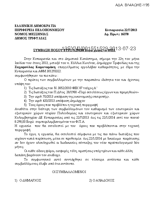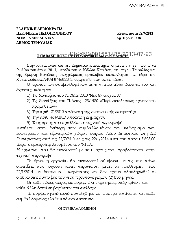 3. ΣΥΜΒΑΣΗ ΓΙΑ ΚΑΘΑΡΙΣΜΟ ΚΤΙΡΙΟΥ ΝΕΟΥ ΔΗΜΟΤΙΚΟΥ ΜΕΓΑΡΟΥ Δ.Ε. ΚΥΠΑΡΙΣΣΙΑΣ