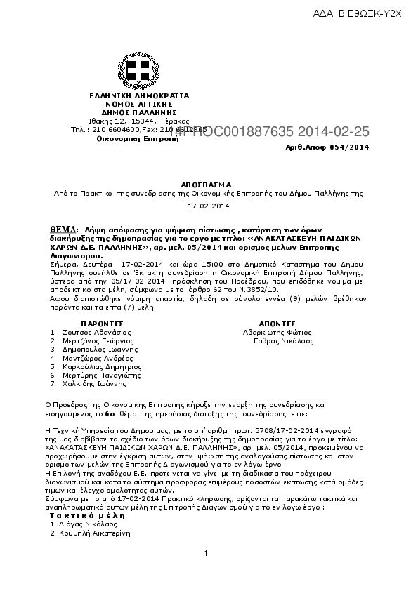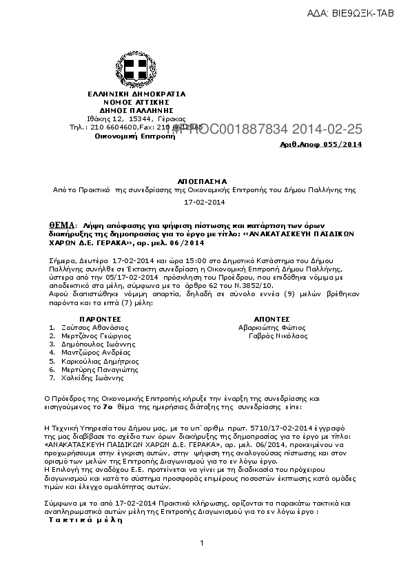 3. Λήψη απόφασης για ψήφιση πίστωσης , κατάρτιση των όρων διακήρυξης της δημοπρασίας για το έργο με τίτλο: «ΑΝΑΚΑΤΑΣΚΕΥΗ ΠΑΙΔΙΚΩΝ ΧΑΡΩΝ Δ.Ε. ΠΑΛΛΗΝΗΣ», αρ. μελ. 05/2014 και ορισμός μελών Επιτροπής Διαγωνισμού.