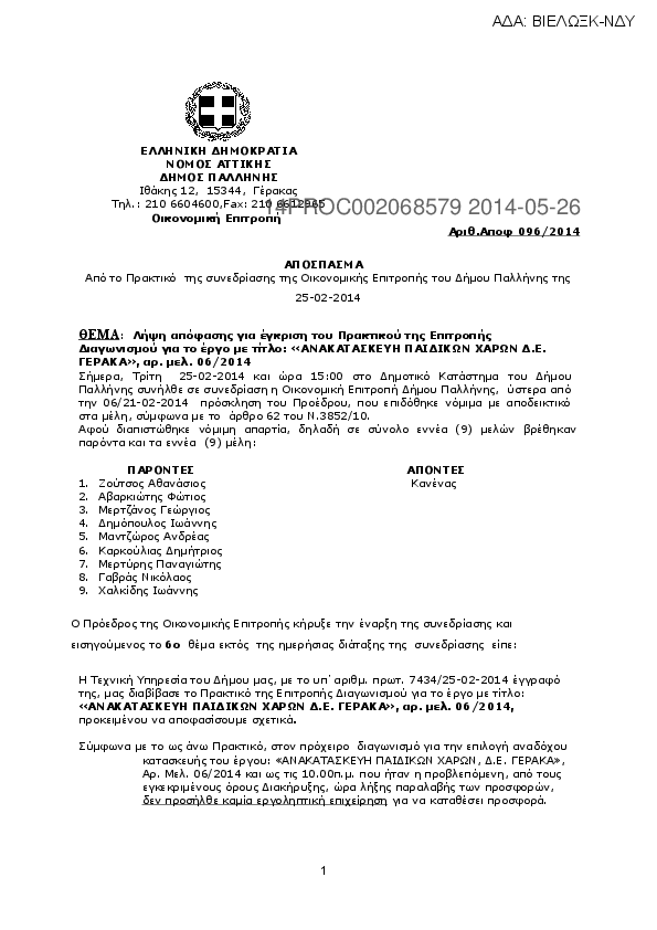 4. Λήψη απόφασης για ψήφιση πίστωσης και κατάρτιση των όρων διακήρυξης της δημοπρασίας για το έργο με τίτλο: «ΑΝΑΚΑΤΑΣΚΕΥΗ ΠΑΙΔΙΚΩΝ ΧΑΡΩΝ Δ.Ε. ΓΕΡΑΚΑ», αρ. μελ. 06/2014