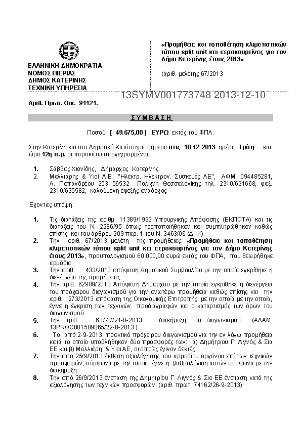 8. Προμήθ και τοπ. κλιματιστικών τύπου split unit και αεροκουρτίνας για τον Δ. Κατερίνης έτους 2013