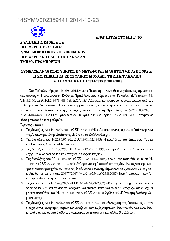 7. ΣΥΜΒΑΣΗ ΑΝΑΘΕΣΗΣ ΥΠΗΡΕΣΙΩΝ ΜΕΤΑΦΟΡΑΣ ΜΑΘΗΤΩΝ ΤΗΣ Π.Ε.ΤΡΙΚΑΛΩΝΓΙΑ ΤΑ ΣΧΟΛΙΚΑ ΕΤΗ 2014-2015 & 2015-201