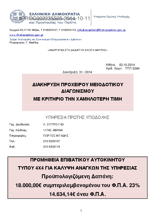 7. ΠΡΟΧΕΙΡΟΣ ΜΕΙΟΔΟΤΙΚΟΣ ΔΑΓΩΝΙΣΜΟΣ ΠΡΟΜΗΘΕΙΑΣ ΟΧΗΜΑΤΟΣ ΤΥΠΟΥ 4Χ4 ΓΙΑ ΤΙΣ ΑΝΑΓΚΕΣ ΤΗΣ Υ.Π.Υ.