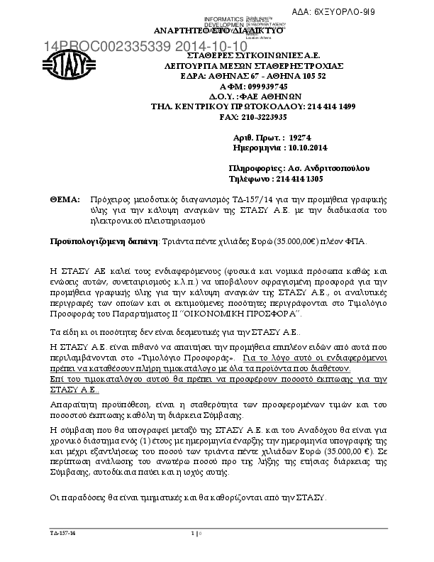 2. Πρόχειρος μειοδοτικός διαγωνισμός ΤΔ-157/14 για την προμήθεια γραφικής ύλης για την κάλυψη αναγκών τ