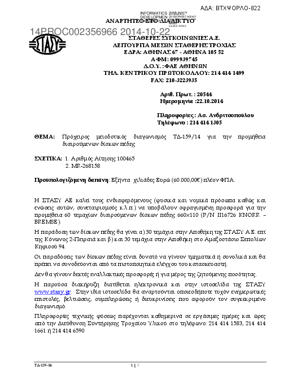 3. Πρόχειρος μειοδοτικός διαγωνισμός ΤΔ-159/14 για την προμήθεια διαιρούμενων δίσκων πέδης