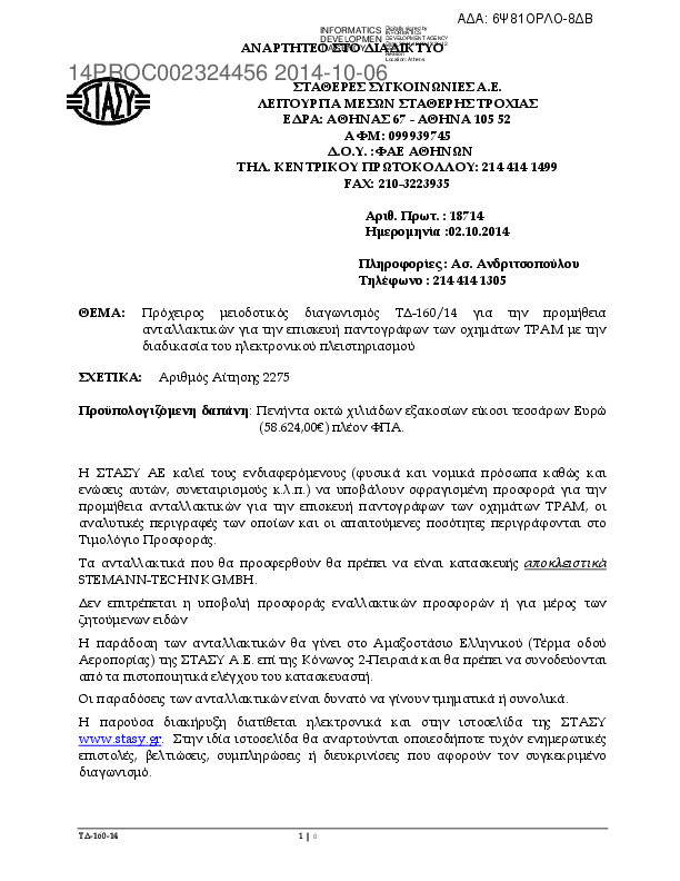1. Προμήθεια ανταλλακτικών για την επισκευή παντογράφων ΤΔ-160/14